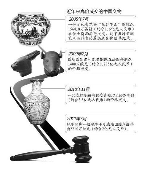 據(jù)聯(lián)合國教科文組織統(tǒng)計,流失到中國境外的中國文物約164萬件,分散在全世界47家博物館,海外民間的收藏預(yù)計是館藏的10倍。近年來,中國文物成了拍賣市場的搶手貨,價格動輒上千萬。