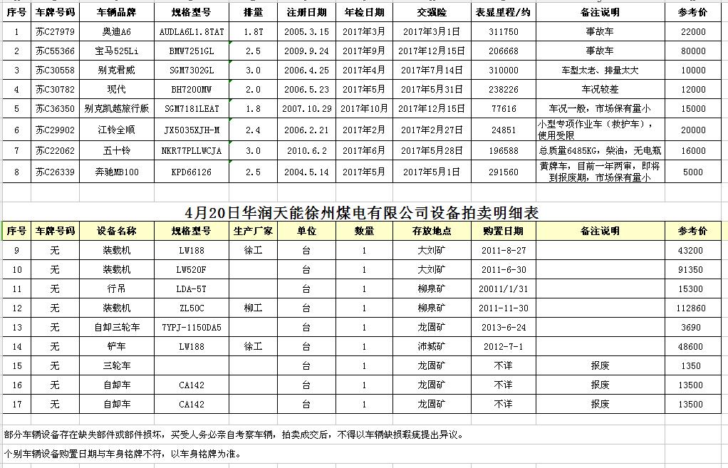 華潤(rùn)天能徐州煤電有限公司車(chē)輛拍賣(mài)明細(xì)表