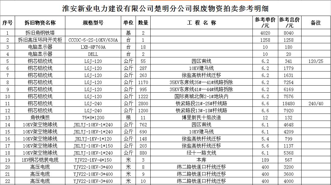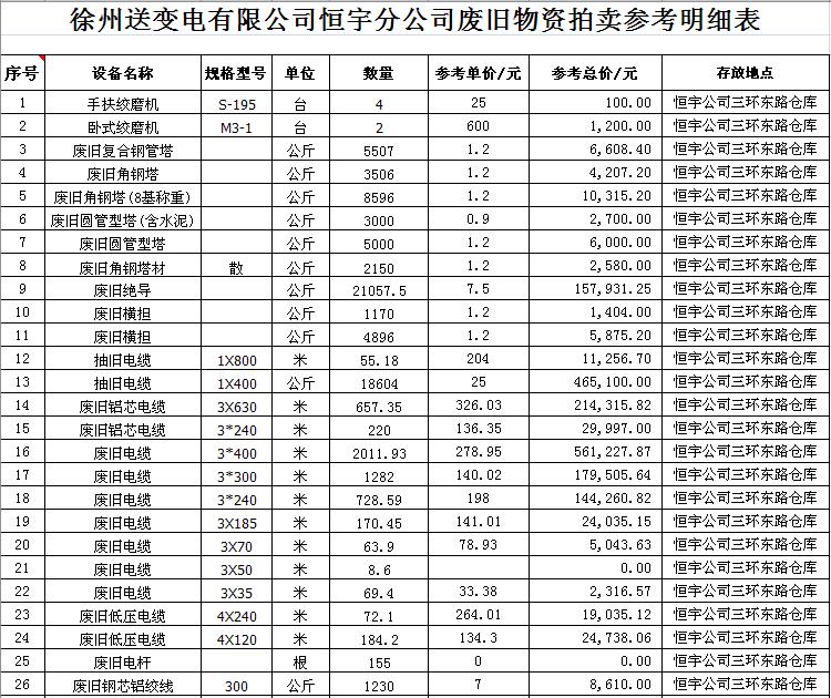 關注微信公眾號受江蘇徐供、淮供集體資產(chǎn)運營中心委托,我公司將通過中國拍賣行業(yè)協(xié)會網(wǎng)絡拍賣平臺以網(wǎng)絡競價的方式公開拍賣以下單位的廢舊物資各一批: