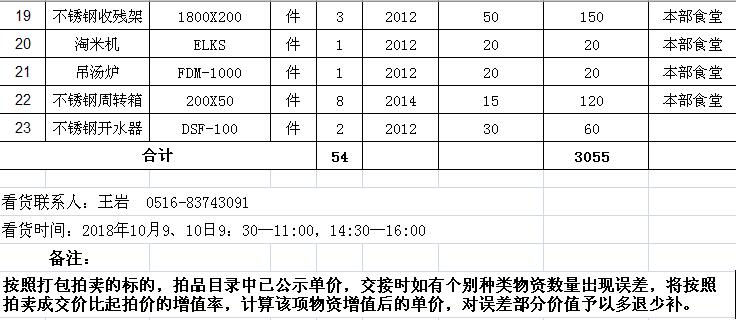 10月9、10日展示。符合條件者請持上述資質(zhì)原件及公章、授權(quán)委托書、法人及代理人身份證等到本公司(徐州市中山南路55號副樓二樓)接受資質(zhì)審核,辦理報名手續(xù),并交納競買保證金5萬元,報名截止至10月11日16時。