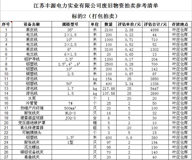 關(guān)注微信公眾號受江蘇徐供集體資產(chǎn)運營中心委托,我公司將通過中國拍賣行業(yè)協(xié)會網(wǎng)絡(luò)拍賣平臺以網(wǎng)絡(luò)競價的方式分兩批公開拍賣其下屬三家集體企業(yè)廢舊物資,主要包括:廢舊電纜、纜芯、鋼帶、導線、開關(guān)、電表、金具、廚房設(shè)備等(詳見拍品目錄)。