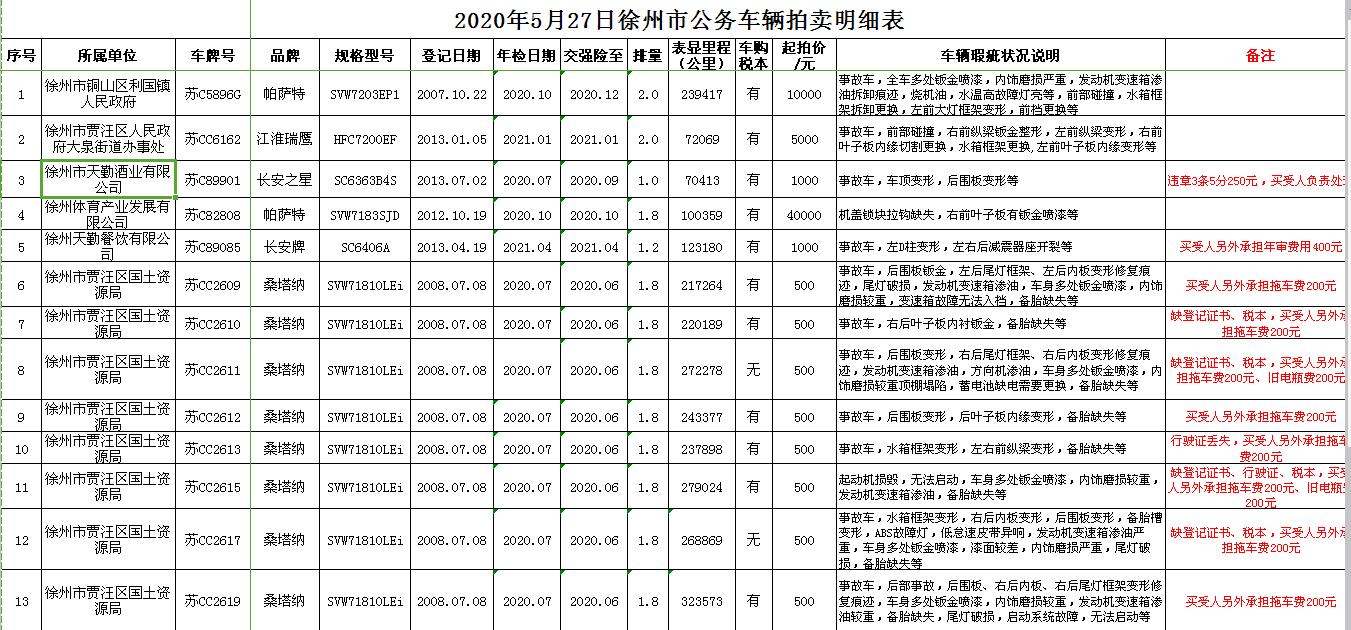 關(guān)注微信公眾號(hào)受委托,我公司定于2020年5月27日13:00時(shí)在徐州市銀地二手車交易市場(chǎng)四樓東南拍賣大廳通過現(xiàn)場(chǎng)和汽車街網(wǎng)絡(luò)拍賣平臺(tái)同步進(jìn)行的方式公開拍賣以下公務(wù)車輛: