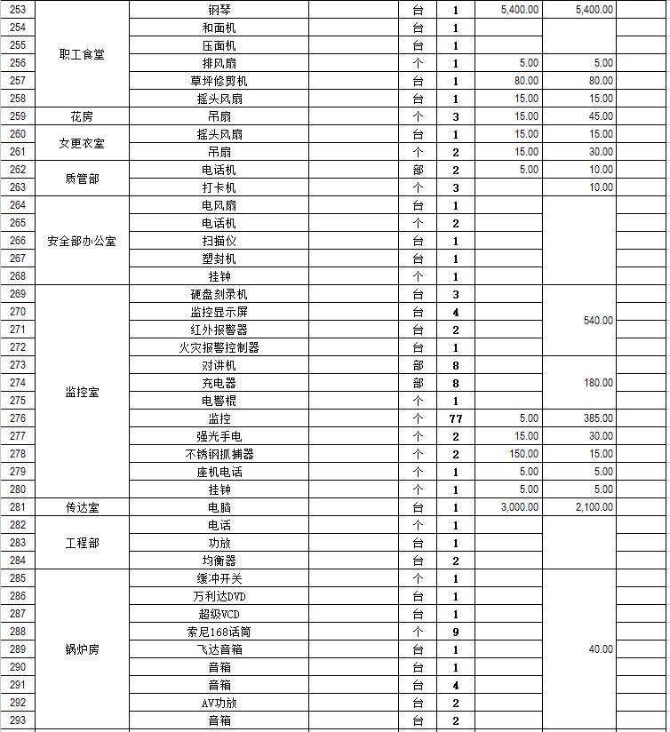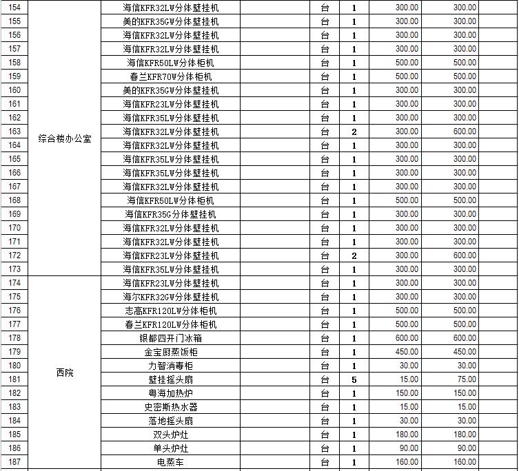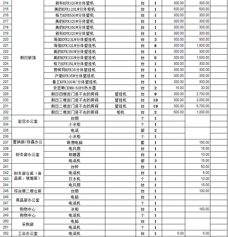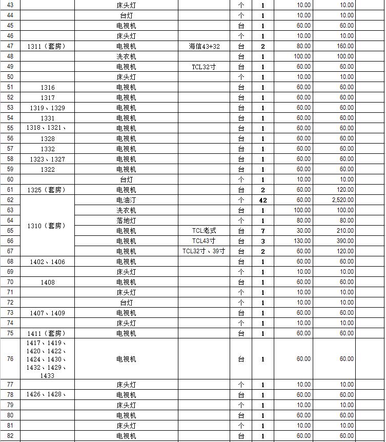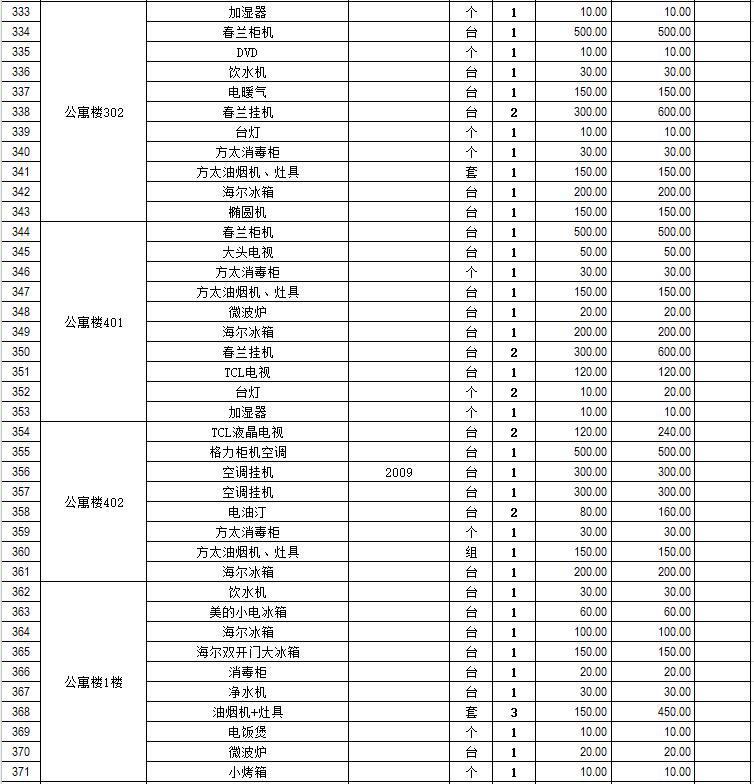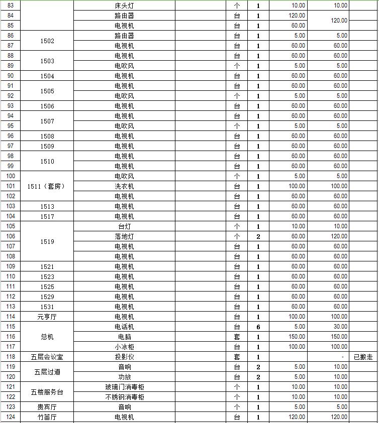 電器設(shè)備主要包含:電視機(jī)、空調(diào)、冰箱、消毒柜、電風(fēng)扇、燈具、電腦、音響設(shè)備、廚房不銹鋼灶具等。